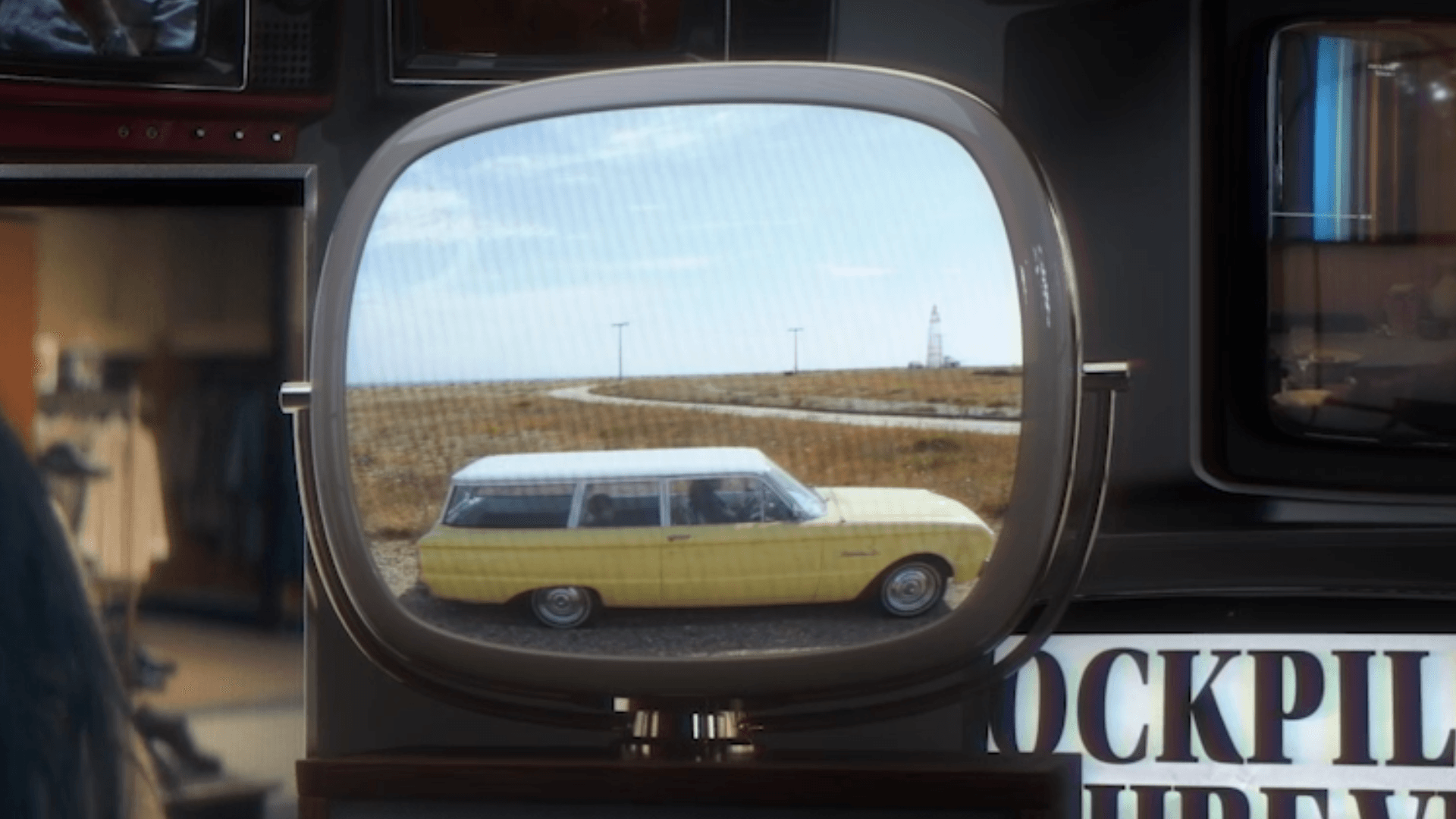 Each episode of the series takes place within a different decade; the televisions we created are designed to match the decade of whichever episode they are showing. Zooming out from the centre allows the television mountain to come into view before the footage once again takes over the whole frame.