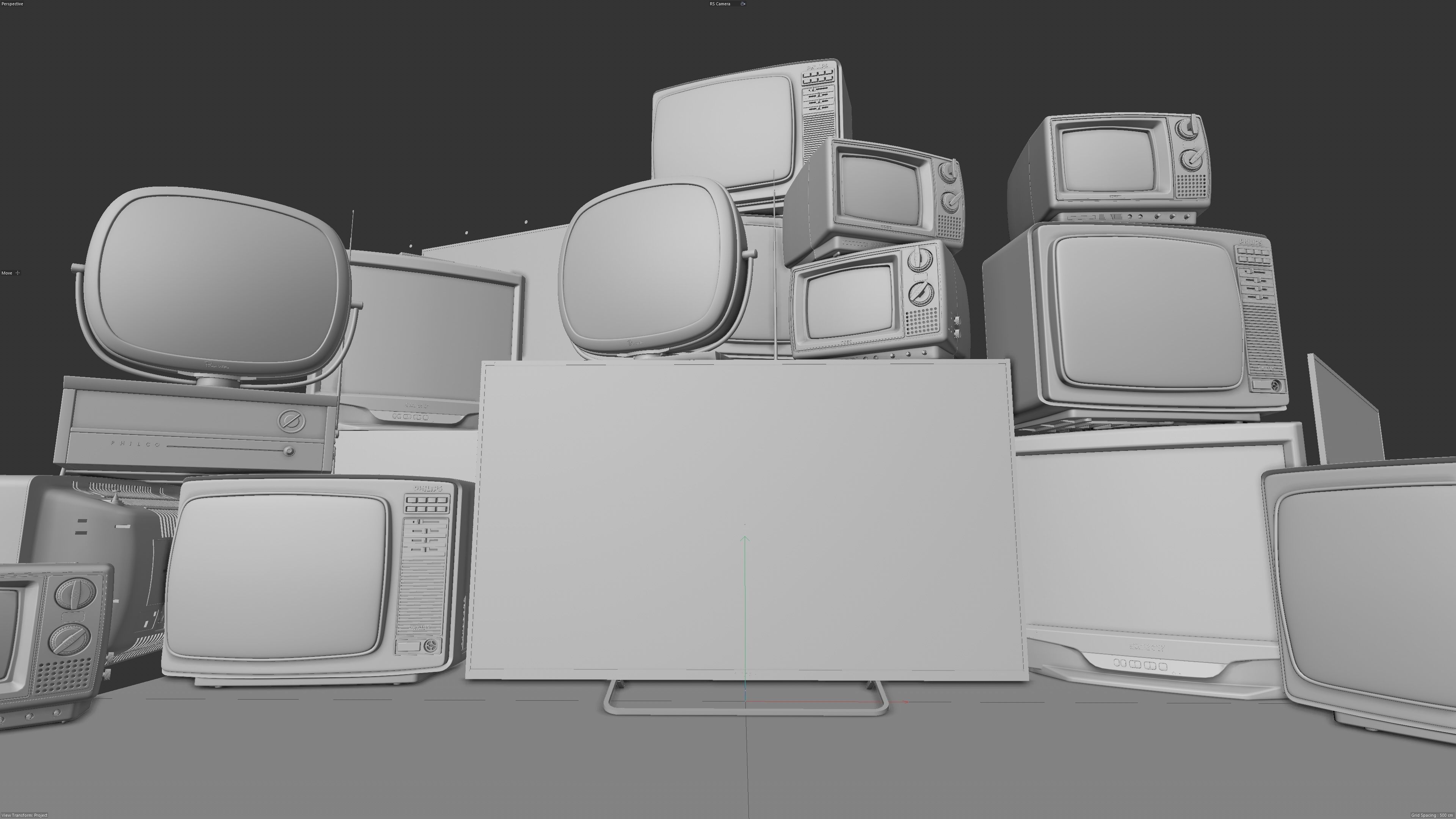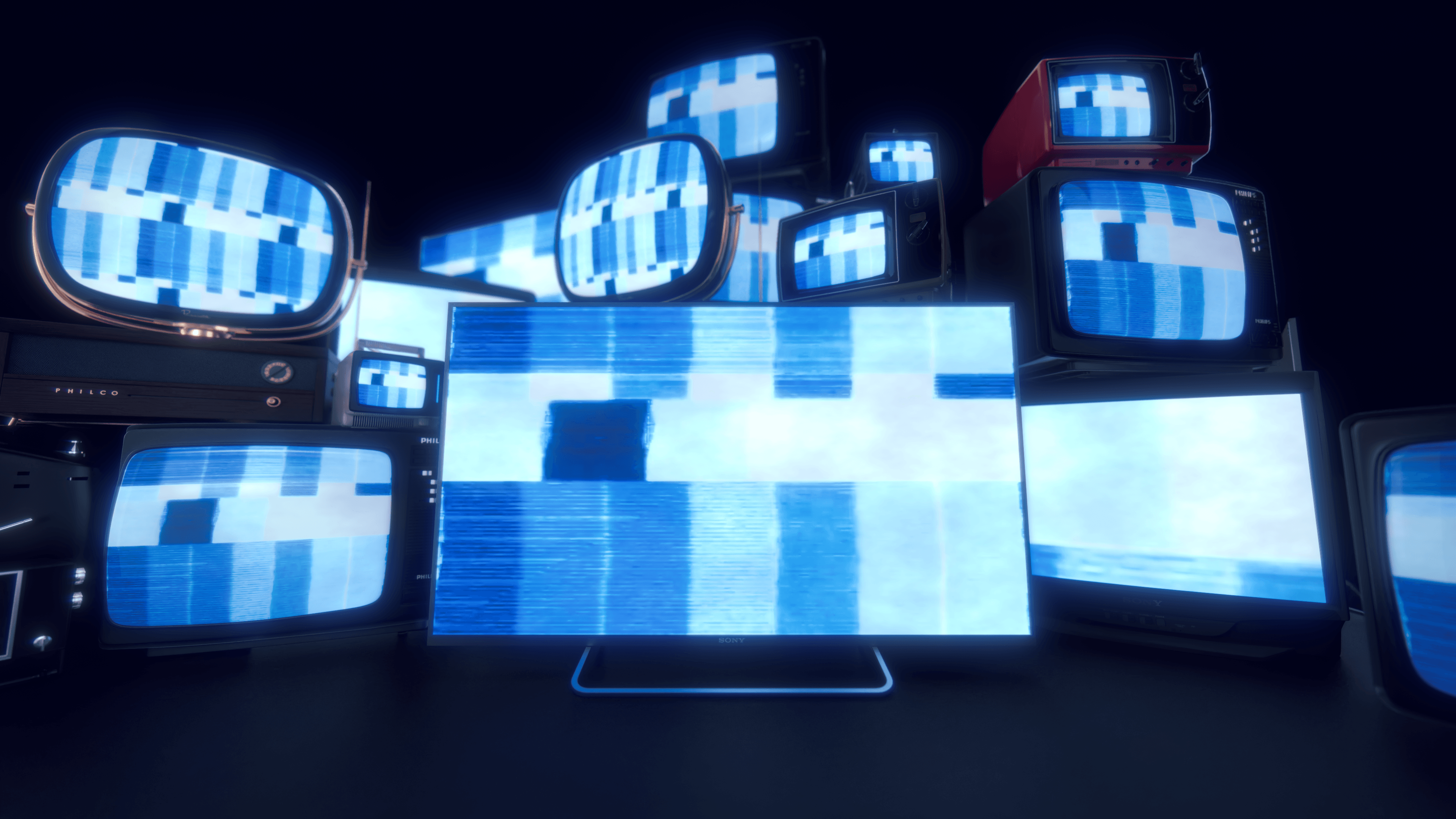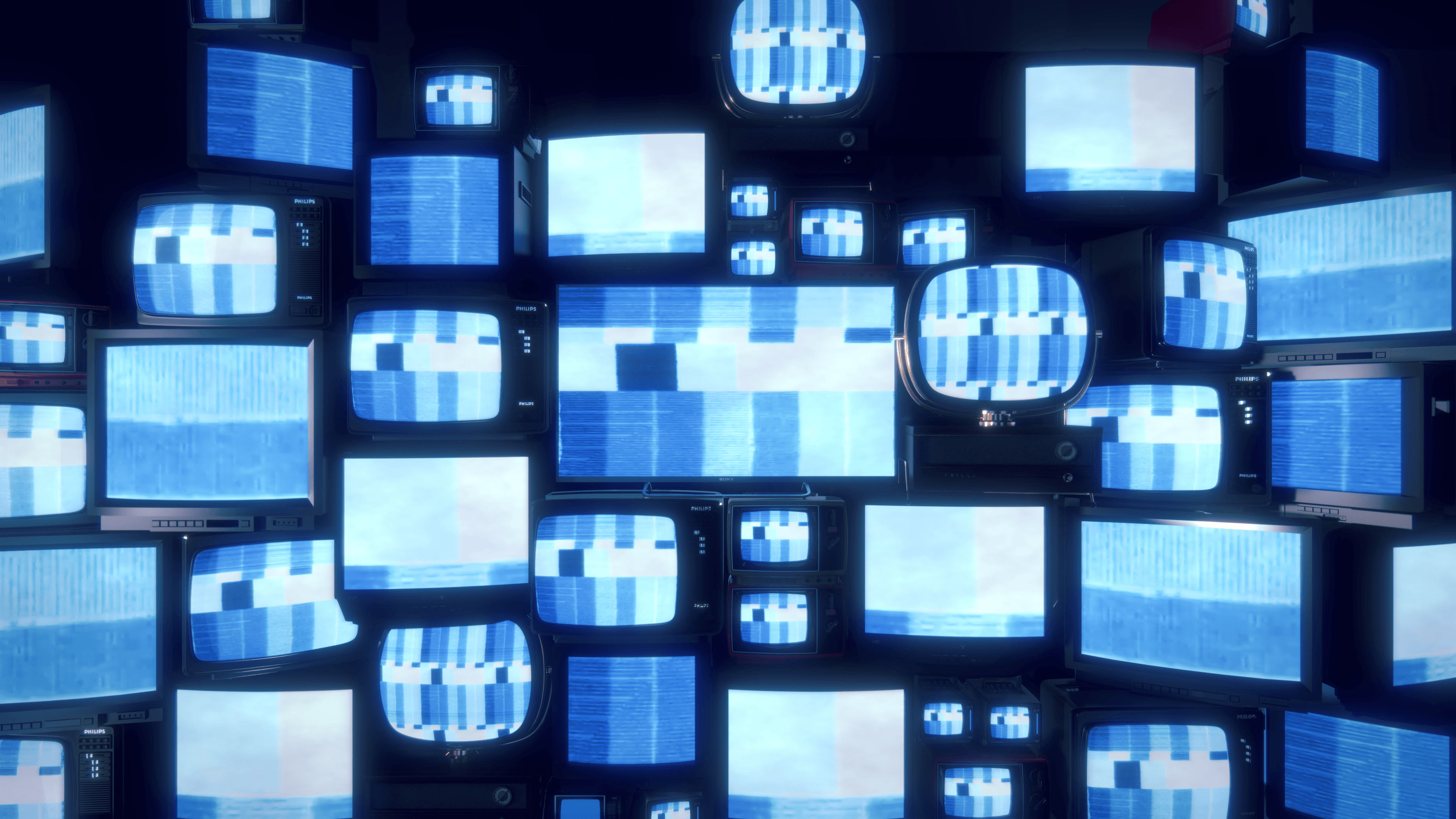A stack of TVs built up in 3D and then populated in post, allowing for much more flexibility and the ability to swap out any content.